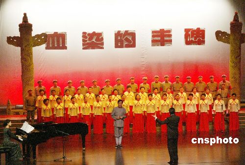 六月二十六日,为纪念中国工农红军长征胜利七十周年和中国人民抗日战争胜利六十周年,曾参加过战争的老红军、新四军、八路军汇聚在北京解放军歌剧院,参加在这里举行的“血染的丰碑”纪念活动。图为北京新四军研究会艺术团、宝塔山合唱团以及哈尔滨军工校友合唱团在活动上演唱历史歌曲。作者:钱兴强