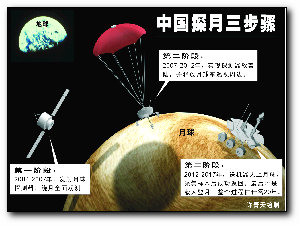 2004年2月,国防科学工业委员会领导对外宣称:中国月球探测计划已经进入实施阶段,将分“绕”、“落”、“回”三步。
