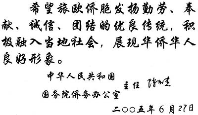 中新网6月29日电 据欧洲时报报道,中国国侨办主任陈玉杰近日为欧洲华文报纸《欧洲时报》题词,向广大旅欧侨胞致意。