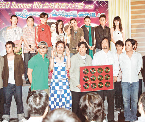 为挽救低迷唱片市道,英皇昨安排旗下歌手容祖儿、谢霆锋、Twins、郑希怡、达明一派、梁洛施、关智斌、Boy'z等齐集“1212+”餐厅出席记者会,宣布将于暑假发起连串大型宣传,包括Twins于七月一日踩入旺角,而七月三日英皇全体歌手将在九龙湾国际展贸中心举行音乐会。