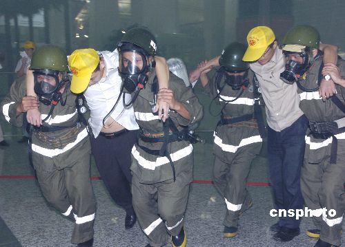 六月二十九日晚十时,广州新白云国际机场首次进行火灾应急救援演练,以检验新机场的应急能力和各单位的配合情况。图为救援人员到场抢救受伤旅客。作者:罗仰明