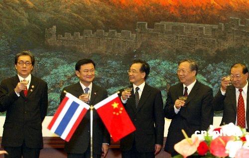 中新网7月1日电 据新华网报道,在中泰两国建交30周年之际,10项双边经贸合作协议于1日在北京签署,项目内容涉及能源、矿产、食品、零售等多个领域。国务院副总理回良玉和泰国总理他信共同出席了签字仪式。
