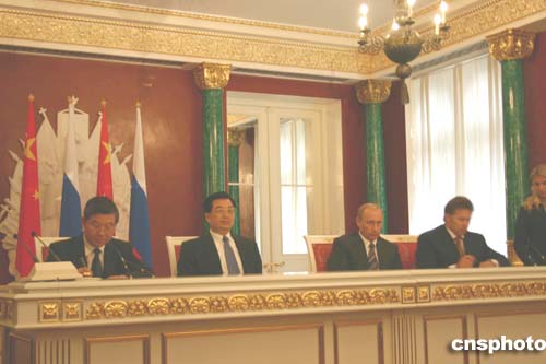 中国和俄罗斯企业界今天在此间签署多项协议,涉及石油天然气、电力以及金融等诸多领域。正在对俄罗斯进行国事访问的中国国家主席胡锦涛与俄总统普京共同出席了签字仪式。图为中国石油天然气集团公司总经理陈耕与俄罗斯石油公司总裁波格丹诺夫签署了《长期合作协议》。作者:齐彬