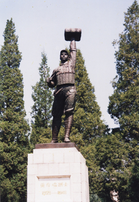 在亭、馆间两条对角线交点上,是翠柏簇拥的董存瑞烈士塑像。英雄身着军装,昂首挺胸,左手高擎炸药包,右手紧握拉开的导火索,再现了董存瑞视死如归的英雄气概。