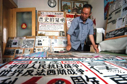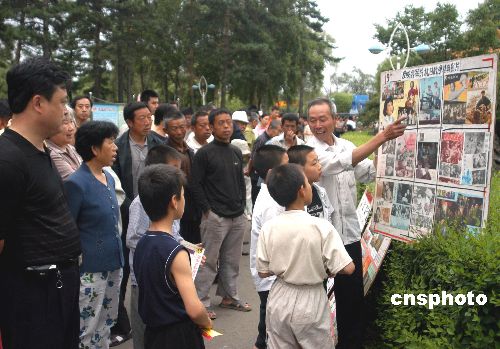 7月4日,牡丹江市空调机厂退休职工李易智把精心准备的抗战胜利60周年画板向市民展出,这是他连续6年的第600多场展出。作者:张克非