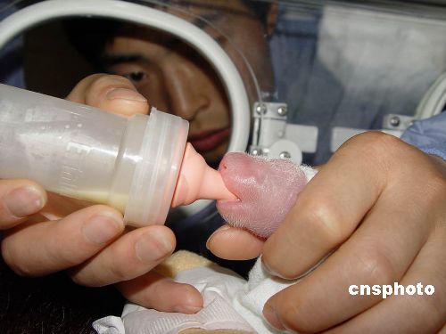 大熊猫“英英”生产持续时间长达十三个小时。科研人员根据大熊猫妈妈只负责养育多胞胎中的一仔的习性,已把握时机成功从母亲“英英”身边取走其中一仔人工养育,并择时与另一仔进行换养。