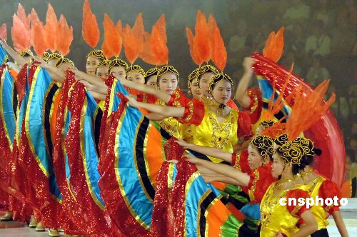 演员们载歌载舞欢庆体育馆落成