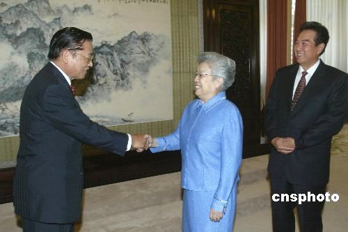 七月六日,中国国务院副总理吴仪在北京中南海会见率团来京参加“海峡两岸信息产业技术标准论坛”的华聚产业共同标准推进基金会董事长江丙坤,并与访问团一行合影。中共中央台办主任陈云林出席会见。作者:史利