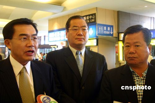 七月七日上午,国民党“立委”李全教(左一)与国民党中央政策会执行长曾永权(中)、亲民党“立委”蔡胜佳(右一)在桃园机场接受采访,介绍八日将在北京就台湾水果登陆细节举行的协商会议。作者:刘舒凌