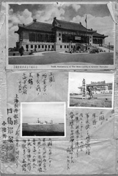 在一块硬纸板上,这位日军军官特意将上海市市政府大楼被日军轰炸前后作了比较。在被炸毁的上海市政府大楼照片中,还显示出一块写有“上海神社建设地”的牌子。这幅照片的图片说明注明当时日军有在上海市府前建靖国神社的企图。在同一纸板后面,所贴的照片显示了当年上海火车站被炸毁的惨状。