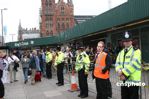 当地时间七月九日,在伦敦国王十字地铁站前,仍有大批警察戒备。作者:齐彬