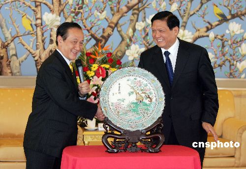 随后,宾主互赠礼物表心意。刘淇向郁慕明赠送了金丝镶嵌景泰蓝九龙壁。郁慕明回赠了名为“华堂集锦”的台湾特色交趾陶,并祝愿中华精神能在古都北京,在这个如花的世界里得以传承光大。