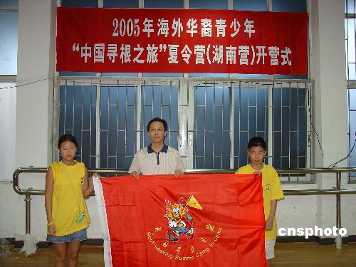 7月11日,2005年海外华裔青少年“中国寻根之旅”夏令营在长沙举行开营式。来自美国和丹麦的华裔青少年将在这里进行为期9天的学习和参观活动。图为湖南省外侨办向营员代表颁授了《中国寻根之旅夏令营》营旗。作者:邓霞