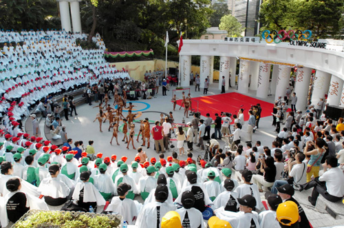 11日,香港举行奥林匹克广场揭幕礼。位于香港公园的广场命名为奥林匹克广场,是香港推广奥运精神的地标,将来会有很多重要体育活动在此举行。国际奥委会主席罗格在港协暨奥委会会长霍震霆的陪同下,为广场启用揭幕。(新华社图)