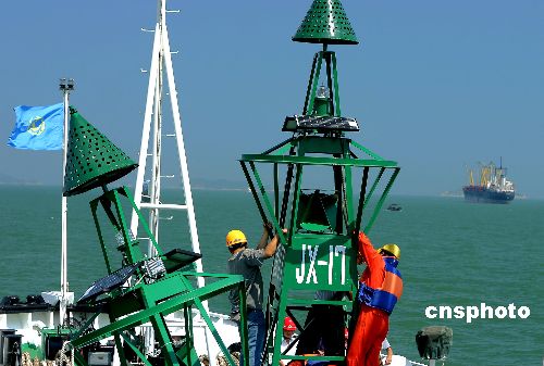 7月12日下午14时,在厦门东南海域离金门大担岛3000米处,一块5吨重的定锚的沉石落下海中,带着锚链的标有“Jx19”号的浮筒投入水中,上海海事局厦门航标处为厦金航道厦门航段抛下了第一座航标,将结束厦金直航航线“有航线无航道”的状态。作者:蓝添艺