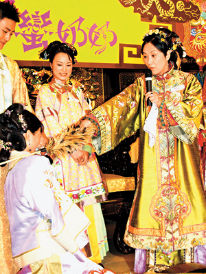 中新网7月13日电 据香港《大公报》报道,“无线”将于下周一推出新剧《我的野蛮奶奶》,昨日一班演员包括汪明荃、胡杏儿、黄宗泽及伍咏薇等,特地穿上清装到珍宝海鲜舫举行“新抱入门仪式”宣传活动。期间“阿姐”、杏儿及Bosco(黄宗泽)除了Rap唱主题曲之外,“阿姐”更如野蛮奶奶“上身”般,向杏儿训示媳妇入门家规时喝令她跪下,之后送杏儿绣花鞋、树叶及鸡毛扫,“阿姐”道:“送树叶是希望你开枝散叶,我看你晚晚都没空。”而杏儿也不是好欺负,斟茶时即对“阿姐”道:“小心呛到!”