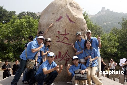 七月十四日,二○○五年台胞青年千人夏令营营员游览北京八达岭长城。图为营员们在长城上合影留念。作者:任海霞