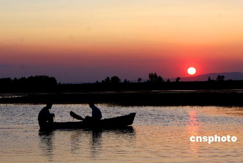 7月10日,新疆哈巴河县巴依乔拉克湿地落日前渔民撒鱼苗时的情景。哈巴河县水利资源丰富,近年来,该县拿出专项资金管护,使全县各类湿地达200多万亩,成了各种鸟类栖息的天堂。作者:金炜