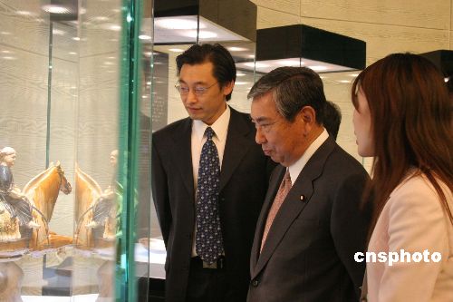 河野洋平依次参观了馆内陈列的豚尊、唐三彩“腾空马”等八件国宝级文物,对三千六百多年前中国就能制作出如此精美的青铜酒器大为惊叹,并称奔马造型的唐三彩十分罕见。在紫檀斋,河野洋平被其中的仿明清宫廷家具深深吸引,对云朵和海浪交错镂空的九龙戏珠大如意大为赞赏。当听说雕工精细的大画筒是二十个雕工艺人足足用了三年时间才雕刻而成时,他更是赞不绝口。