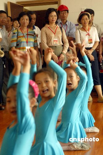 七月十六日,四十余名台湾中小学校长应宋庆龄基金会邀请来大陆交流参访,以增进海峡两岸教育工作者之间的友谊和了解,共同探讨教育中的问题,共商育人大计。图为台湾客人观摩北京市酒仙桥第二小学的舞蹈课。作者:史利