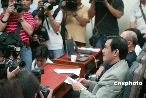 七月十六日晚,中国国民党主席选举揭晓,台北市长马英九高票当选。图为马英九在台北国民党中央党部记者会上发表获胜感言。作者:盛佳鹏