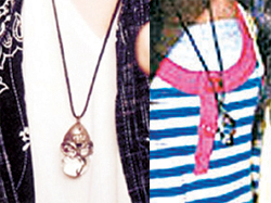 读者昨爆料,直指“仔仔和大S戴同款情侣项链”,记者查证结果,上周五大S在机场准备赴上海时,以及前天她陪妹妹徐熙娣(小S)试婚纱,所戴的一条黑色皮质的链带、半透明状的椭圆形坠子,可能是水晶或玛瑙之类材质的项链,和仔仔的宣传照,戴的是同款项链,仔仔的发型和上周五亮相时一样,应是近期拍的。