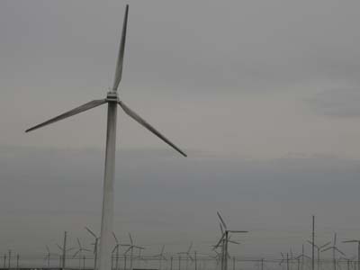 在从乌鲁木齐去吐鲁番的路上,一大片风力发电机挑起了不少游人的兴趣。