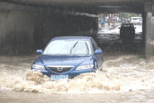 今年第五号台风"海棠"预计将于七月十九日下午至夜间在福建省沿海登陆。十九日上午福州市区一低洼地带大雨积水成河,过往车辆行进不畅。作者:刘可耕
