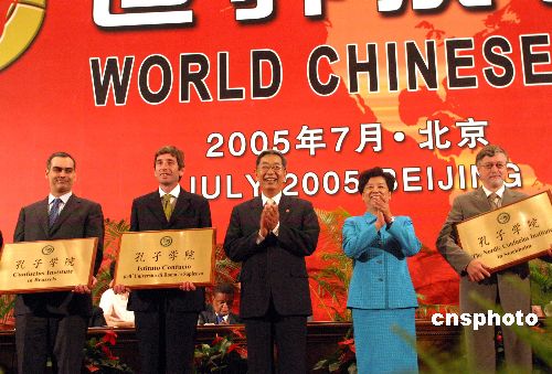 七月二十日,世界汉语大会在北京人民大会堂开幕。来自海内外五百余名政要、政府官员、大学校长、著名汉学家和汉语教学工作者,将共同探讨“多元文化架构下的汉语发展”。图为全国人大副委员长许嘉璐、国务委员陈至立为孔子学院授牌。作者:张勤