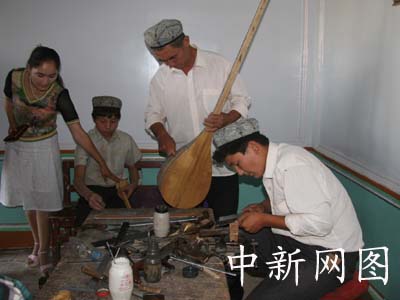 老艺人热合曼·阿布都拉带领孩子在做乐器
