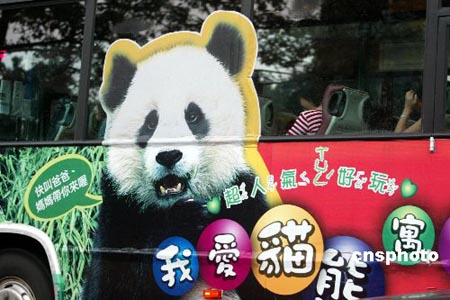 七月二十一日,一辆绘有大熊猫广告画的公共汽车在台北忠孝东路上行驶。今年五月,大陆决定赠送台湾大熊猫以来,在台北民众中掀起了大熊猫热潮。作者:盛佳鹏
