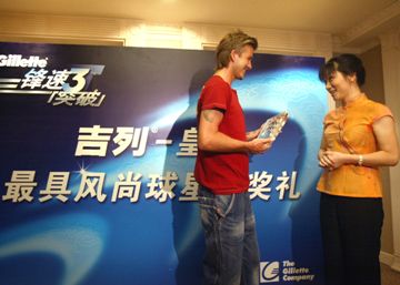 在他谈到对“吉列-皇马最具风尚球迷评选”决赛的三个候选人的看法时,他说:“如果你的球迷不仅仅能够欣赏你踢球的动作,也能够理解你的个人风尚,这对于一个球员来说真是太棒了!”之后他为由在场媒体评委选出的最具风尚的球迷颁发了奖杯。据悉此前贝克汉姆刚刚在“皇马中国行”官方网站上举行的“吉列-皇马最具风尚球星评选”中获得了最具风尚球星的称号,并且在中央电视台的《天下足球豪门周-皇家马德里专场》中接受了吉列公司市场总监谢冰先生的颁奖,因此由他来给最具风尚的球迷颁奖,显然是顺理成章。