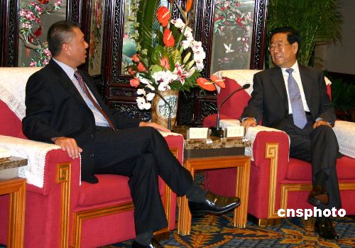 7月24日下午,澳门特首何厚铧率团来到成都,将出席25日开幕的第二届“泛珠三角区域合作与发展论坛”。中共四川省委书记张学忠(右)会见了何厚铧一行。作者:杨杰