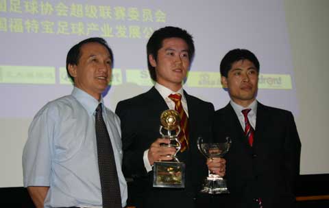 中新网7月26日电 7月25日,首届中超联赛各项最佳在香河基地颁奖,辽宁队队长肇俊哲当选足球先生,并捧走金球奖,最佳射手阿尤获金靴奖、实德队国青队小将陈涛获得最佳新秀、曾带领深圳队夺冠的朱广沪获选为最佳教练,孙葆洁当选最佳裁判。