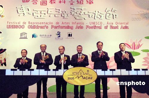 “联合国教科文组织东亚儿童艺术节”,廿八日在澳门文化中心揭幕,有来自中国、日本、朝鲜、韩国、蒙古及澳门、香港等国家和地区儿童代表五百多人参加,澳门特区行政长官何厚铧、联合国教科文组织总干事松浦晃一郎等主持开幕式。作者:梁永强