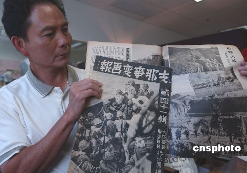美国旧金山华人收藏家姜家声展示在旧货市场寻求的《支那事变画报》,此为日本侵略中国和亚洲时期显示战功的出版物。姜家声先生在今年七月纪念中国抗日战争胜利六十周年时,用以揭露日本发动战争的罪恶行径。作者:贾国荣
