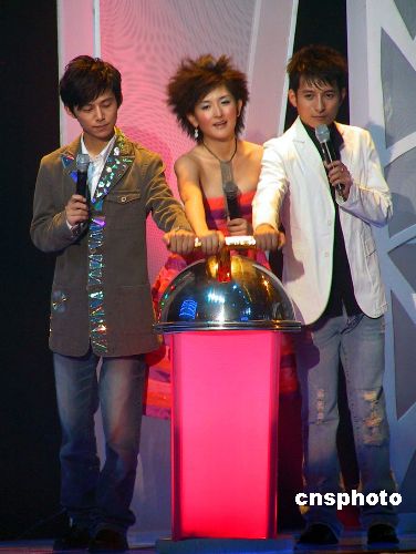 7月30日晚,陪伴中国观众走过8年岁月的娱乐节目《快乐大本营》进行了改版晚会,快乐主持群何炅(左)、李维嘉(右)、谢娜进行了一场告别演唱会。在接下来的一个月里,他们将通过观众短信票选来决定谁能继续留任。图为快乐主持群一起开通短信支持通道。作者:邓霞