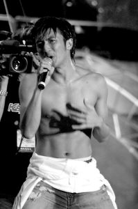 谢霆锋最后出场做压轴表演,第一首歌唱完后,他突然脱掉上衣,表示要和歌迷一起淋雨,并猛往身上浇水。霆锋越唱越兴奋,竟把鞋子也踢掉,不停地满场奔跑,令歌迷疯狂不已。