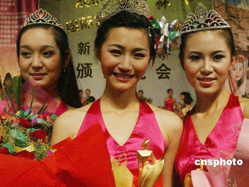 七月三十一日晚,“龟兹杯”2006国际旅游小姐新疆区总决赛在南疆阿克苏市举行,四十名入围佳丽在决赛上展示泳装、民族服饰以及晚装,经角逐来自乌鲁木齐市的选手付苓获得大赛冠军(中)、梁爽获得亚军(右)、维吾尔族选手妮鲁拜尔获得季军。作者:钱兴强