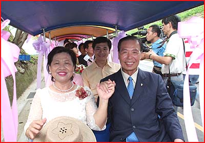 中新网8月1日电 据《中央日报》报道,“2005台中县两马观光季”“喜事连连爱相随幸福久久集体婚礼”昨天(31日)在台中县后丰铁马道9号隧道口的夫妻树广场举行,台中县长黄仲生夫妇与县“议会”副议长陈芳隆共同为24对新人福证,随后新人们搭乘电动小火车畅游9号隧道及花梁钢桥,与历史共同做见证。