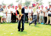 曾志伟是昨天一早先于明星队伍到达现场的。前段时间一直坐在轮椅上的他已经可以一瘸一拐地下地走路了,而且坚持不让别人搀扶,总算顺利打出了漂亮的第一杆。