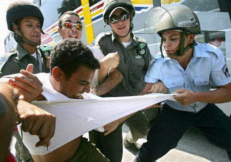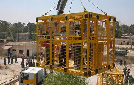 扮演拒不撤离的犹太定居者的警察被关进铁笼