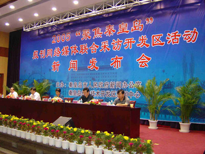 中新网秦皇岛8月2日电 由中新网、人民网、中广网等媒体参加的2005“聚焦秦皇岛”报刊网络媒体联合采访开发区活动新闻发布会,今日上午,在秦皇岛开发区管委会报告厅召开。报刊网络媒体秦皇岛开发区行正式启动。