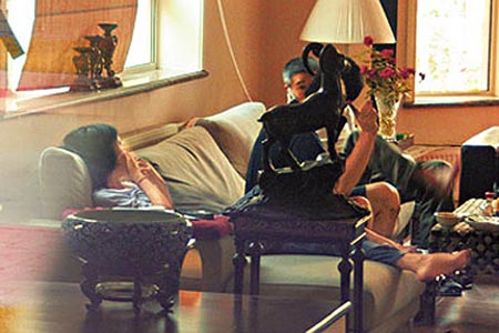 第二日,王菲与李亚鹏在第二日下午四时先起身,穿住T恤长裤,人字拖的王菲,与短衫短裤的李亚鹏由二楼睡房下到地下客厅,懒慵慵身贴身“摊”在巨型梳化上,“脚印印”看电视送“早餐”。由于二人婚前已同居一段时间,所以感觉相当老夫老妻。当发现有记者拍照时,王菲反应相当敏捷,即时通知老公,并用手掩面,因不防有此一招,原本吊在她脚尖上的人字拖,亦在慌忙中飞脱落地下。