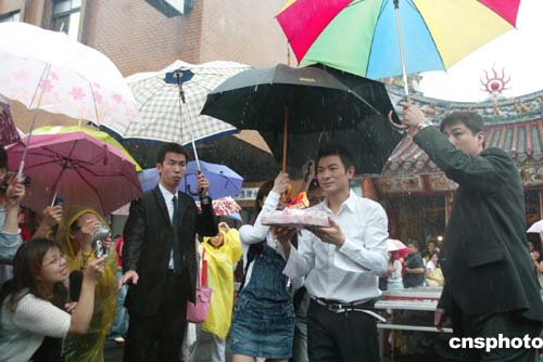 原来每次华仔到台湾宣传唱片时,都会遇上大风雨,华仔说:“水为财嘛,每次我宣传下雨,唱片都会卖得好好,这次都希望过百万啦。只有三年前我打官司不能出唱片时,那次就是唯一一次没下雨。”