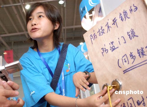 辽宁本溪二十六中的女生关丽,周末在北京举办的“第二十届全国青少年科技创新大赛”上,兴奋地向观众展示自己独创的防盗门锁。关丽防盗门锁是采用了两个以齿轮内部连接的锁芯,当“锁王”以技术手段拨动一个锁芯时,却带动不了另一个锁芯,因此保险系数大大增加。作者:邹宪
