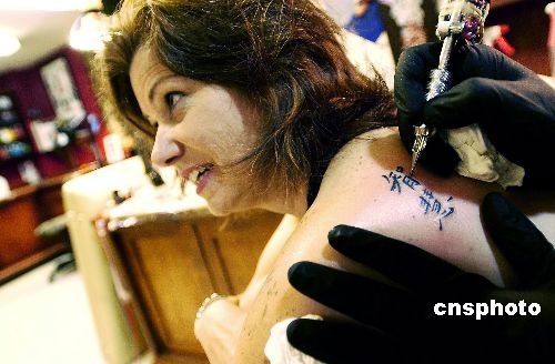 正在功读心理学博士的美国人帕特丽夏女士八月将迎来四十四岁生日,她送自己一个独具风格的生日礼物——用汉字“智慧”两字纹身。纹身在美国多元文化中非常普遍,许多人选择汉语的词或字符纹身,是因为汉字的艺术可观性并且充满东方神秘感。美国的许多著名演员和歌手都纹身刺字,以此推广为大众化艺术。作者:陈钢