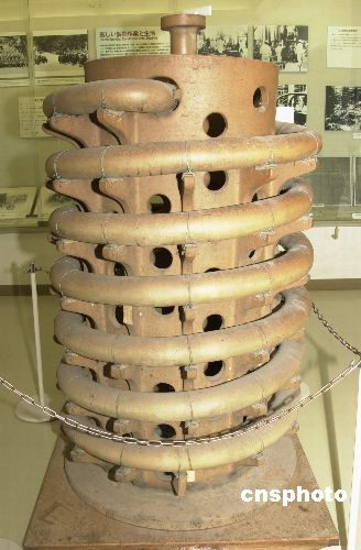 图为岛上资料馆内展示的当年用于制造芥子气和糜烂性毒瓦斯等化武液化气的冷却装置。 作者:王健