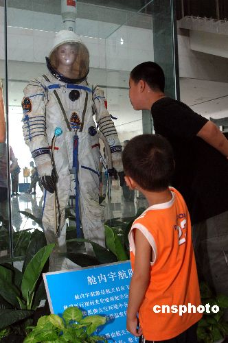 八月十日,在福州举办的“飞向太空--中国载人飞天科技展”上,一套价值一亿多元人民币的航天服吸引了众多观众。该航天服能抵御太空环境中各种危害航天员的因素,如真空、无氧、高低温变化,太阳辐射等。作者:王东明