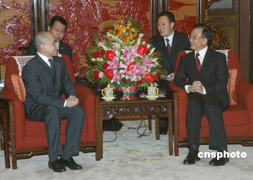 八月十日,中国国务院总理温家宝在北京中南海会见来访的柬埔寨国王西哈莫尼。作者:史利
